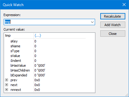 Quick Watch: This dialog is an interface for evaluating keyboard-entered expressions and viewing the result of the evaluation within a data display tree. Expressions are evaluated in the context of the current debug stack frame, so this feature is available only when a debug session is active and the debug program has been paused or has stopped at a breakpoint or exception.