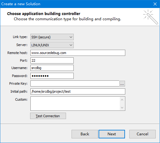 Suppose there is a project folder /home/srcdbg/project/test in the server www.sourcedebug.com and the cross-compiled executable is /home/srcdbg/project/test/srcdbg_test. srcdbg_test is put into the /data/test/ directory on the arm board to run and debug. gdb is also on the arm board for debugging application. Here are steps to create a new project.
