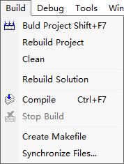 | Rebuild Project | Rebuild the active Project. The Clean action is executed before the Project is built. |
