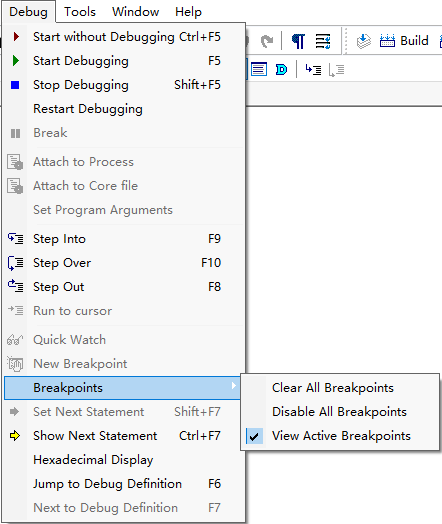 | Breakpoints | Clear All Breakpoints | Clear all breakpoints. |