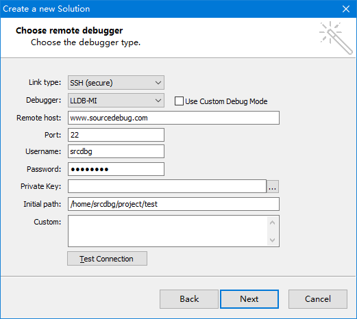 Suppose there is a project folder /home/srcdbg/project/test in the server www.sourcedebug.com and the executable file is /home/srcdbg/project/test/srcdbg_test. Here are steps to create a new project.
