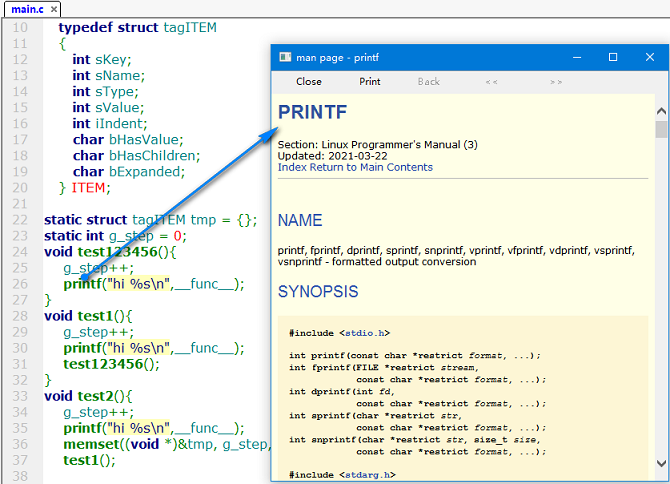 SourceDebug embeds the latest Linux programmer's manual. During code browsing, press F1 on a keyword to launch the man page window. The manual documentation for the current keyword can be displayed. You can also jump to other keywords that interest you.